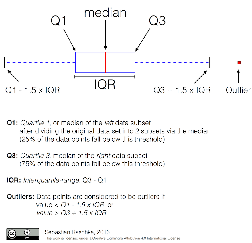 Here we also compute inter-quartile range IQR=Q3-Q1, and so-called outliers - values, that lie outside the boundaries [Q1-1.5IQR,Q3+1.5IQR].